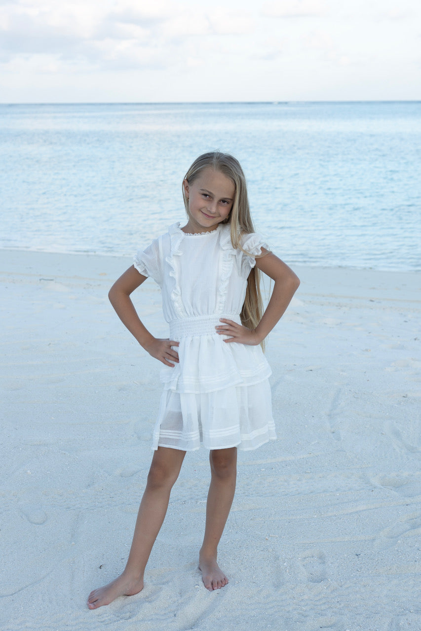 Elegant kjole i myk bomull med broderier, puffede ermer, volanger og elastisk smock i livet. Skjult glidelås for en sømløs passform. Finnes i hvit og blå. Perfekt til enhver anledning! 100% bomull
