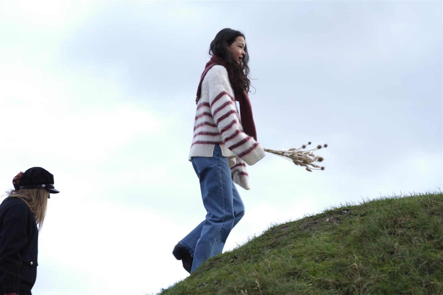 Myk børstet hvit og burgunder stripete oversized genser. 35 % polyamid 33 % alpakka 32 % ull