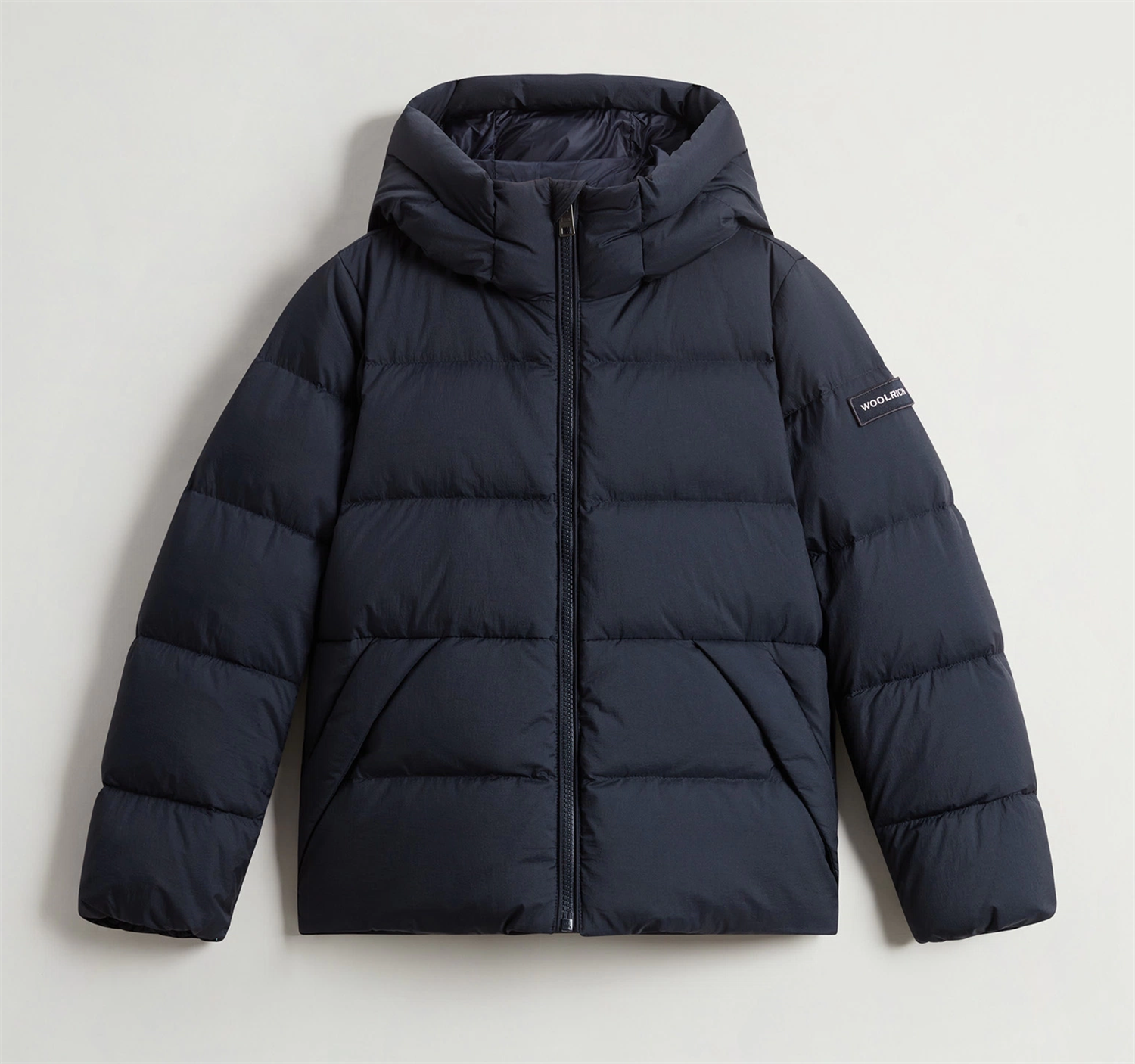Jakke laget av vannavvisende og vindtett krøllet nylon. Den er polstret med andedun og har en bred hette, stående krage og praktisk glidelås. Den har klassisk horisontal quilting og to skrå lommer for å holde små gjenstander innen rekkevidde. 80% dun, 20% fjær