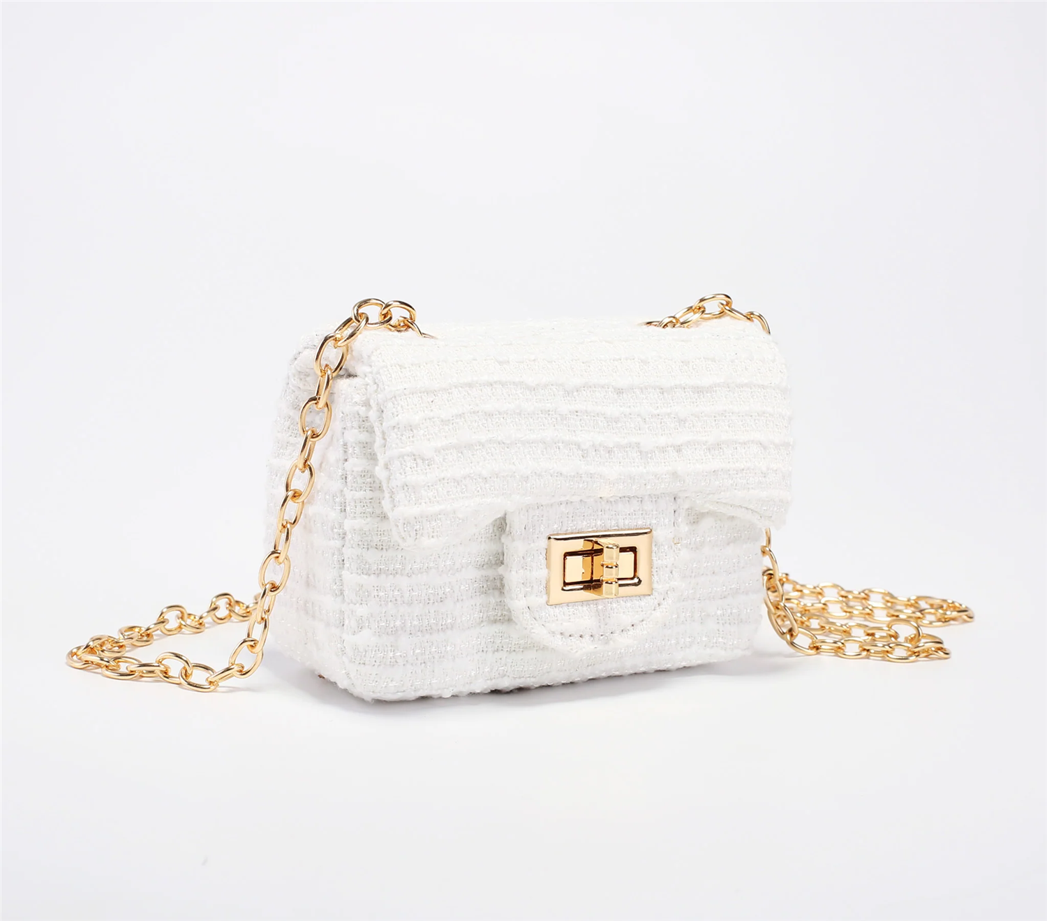 Denne søte lille vesken er det perfekte tilbehøret for unge jenter som elsker å kle seg ut. Den har et mykt stoff med subtile stripedetaljer, og gir et klassisk, men likevel lekent utseende. Den elegante gullfargede kjederemmen og vrilås-lukkingen gir et snev av sjarm og raffinement. Lett og akkurat passe størrelse for små hender, denne vesken er ideell for bursdager, familiesammenkomster eller hverdagslek. En søt liten skatt for de minste fashionistaene!