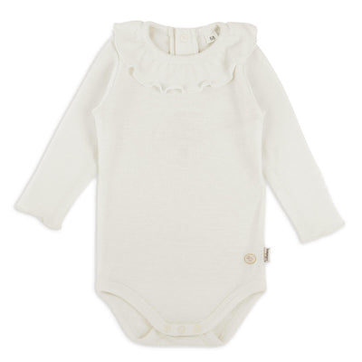 Ullbody med krave i den mykeste merinoull som er kløfri og myk mot huden. Bodyen er kjempesøt under andre plagg, og kan brukes til både gutter og jenter. Den har trykknapper bak i nakken og i skrittet.