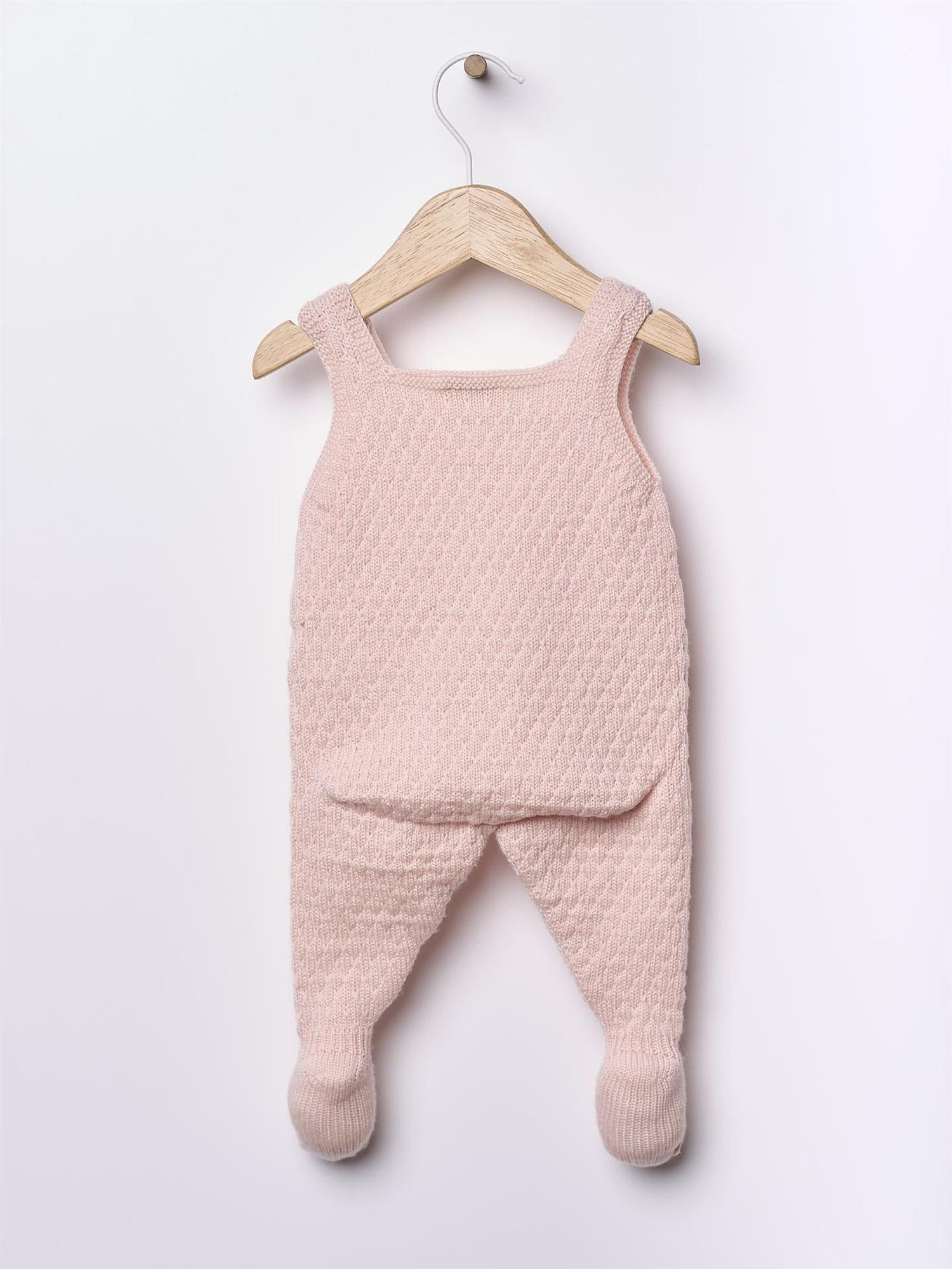 Selebukse med føtter, strikket i en vakker merinoull.Festes med kokosnøttknapper på stroppene og mellom bena med trykkknapper. 100% merinoull